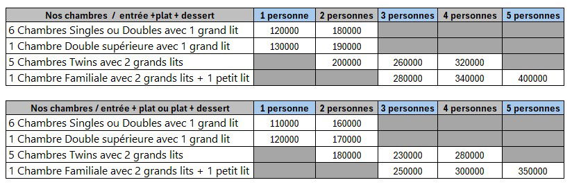 * Toutes nos réservations des chambres se font uniquement en demi-pension( Diner / chambre ) * All our room reservations are only half-board (Dinner / room / ) ------------ * Les prix convertis en € sont à titre informatif et peuvent varier selon le cours du jour – les paiements se font uniquement en Ariary * Prices converted into € are for information purposes only and may vary depending on the daily rate – payments are only made in Ariary